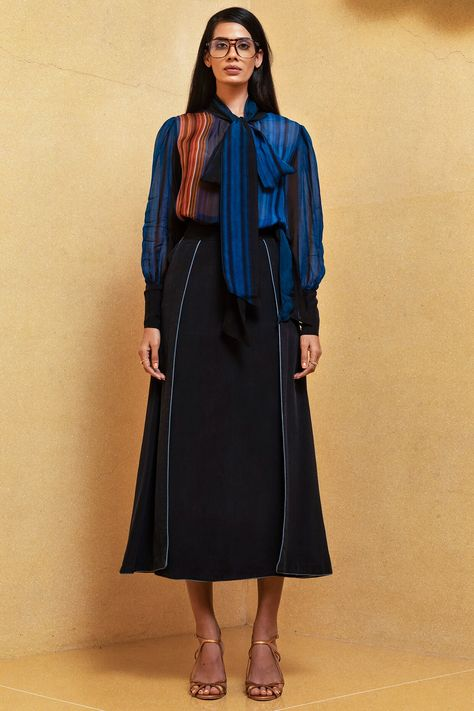 Bow Blouse + A-Line Midi Skirt: Craving color? Pair a colorful blouse with a sleek a-line skirt